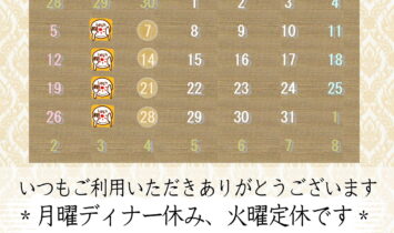 2025年10月の営業予定について定休日の火曜日を除き、11時からランチ営業中です。最大4つの料理を選んで毎日日替わりのオリジナルランチをお楽しみいただけます。セルフですがドリンクサービス継続しています。ディナー営業(18:00~21:00L.O.)について月曜と火曜を除き、…