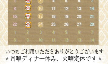 2026年2月の営業予定について火曜日を除き、11時からランチ営業中です。料理を自由に組み合わせるオリジナルランチをお楽しみいただけます。セルフサービスですがドリンクサービスも継続しています。ディナー営業(18:00~21:00L.O.)について月曜と火曜を除き、18時からの…