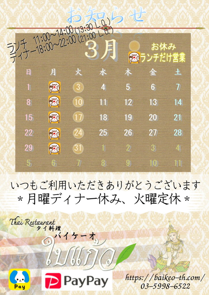 2026年3月の営業予定について